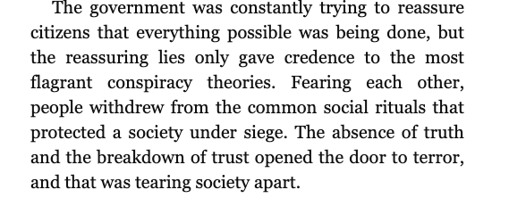 A paragraph from Lawrence Wright's THE END OF OCTOBER published a few weeks ago, a fictional novel about a global pandemic. Terrifying read because so much of it seems like news stories we're seeing right now.
